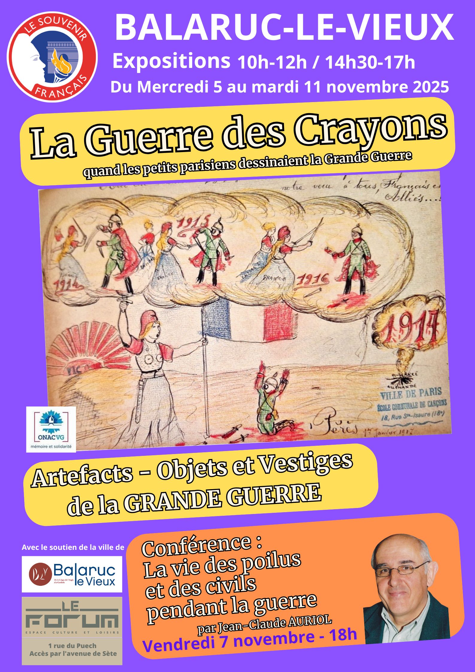 L'association Le Souvenir Français, en partenariat avec la Ville de Balaruc-le-Vieux a le plaisir de présenter 2 expositions du mercredi 5 novembre au mardi 11 novembre (10-12h / 14h-17h) et une conférence, le vendredi 7 novembre à 18h.