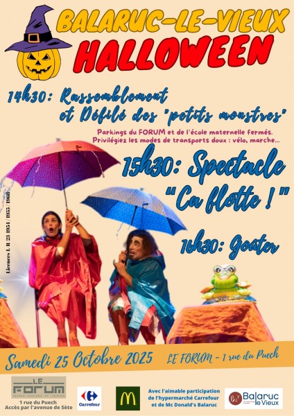 Dès 14h30, rassemblement sur le parking du FORUM pour un défilé effrayant puis à 15h30 retour au FORUM pour le spectacle clownesque "Ca Flotte".